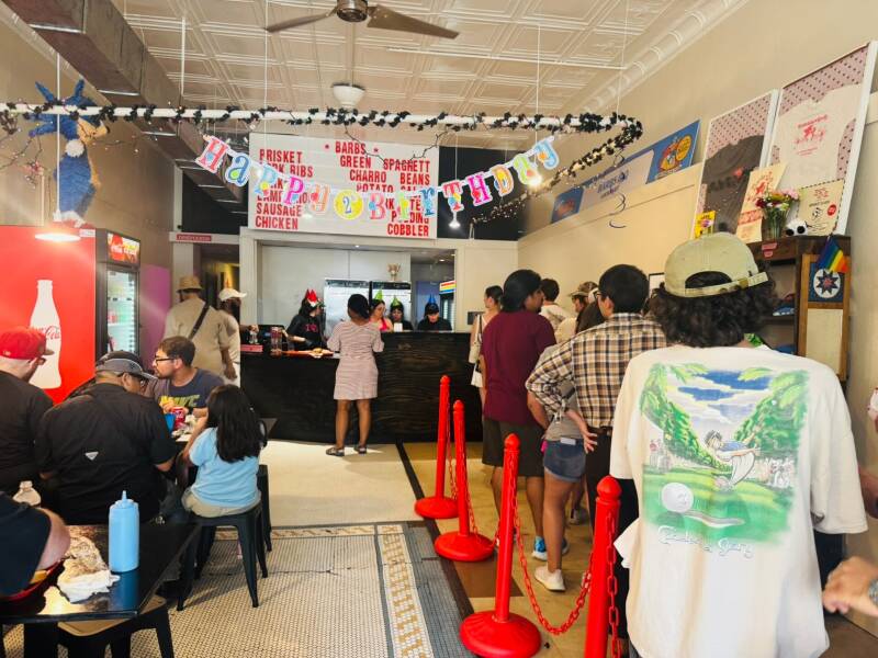 We're fans of Chuck and have been there a few times since she opened 2 years ago. We had to make the drive and join the celebration. The pork ribs and sausage makes me so happy. The green spaghett is a must as it's unique to most BBQ places blending the creaminess and poblano peppers that compliments her BBQ proteins. The hospitality is authentic and the staff made sure those of us in line were hydrated as it was getting Texas warm. They gave us updates as to what was running low, we missed out on the lamb chops and beef ribs. When we finally made it to the counter, Chuck was so gracious to everyone and there was a young man helping us get the chocolate pudding and bringing our tray to a table. The only disappointment was taking too long to eat to get a t-shirt they were printing on site. Just like good BBQ it sold out. I do hope they print more of the green smoker shirt and will happily buy one next time :-). We always bring a cooler to bring extras home as these reheat well, too!