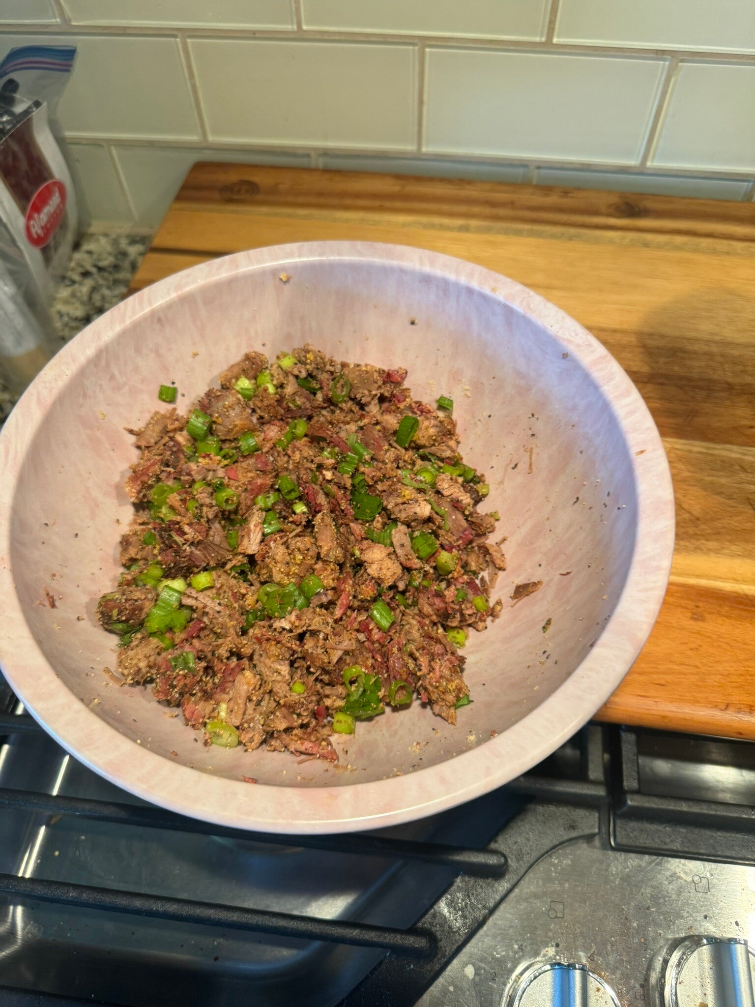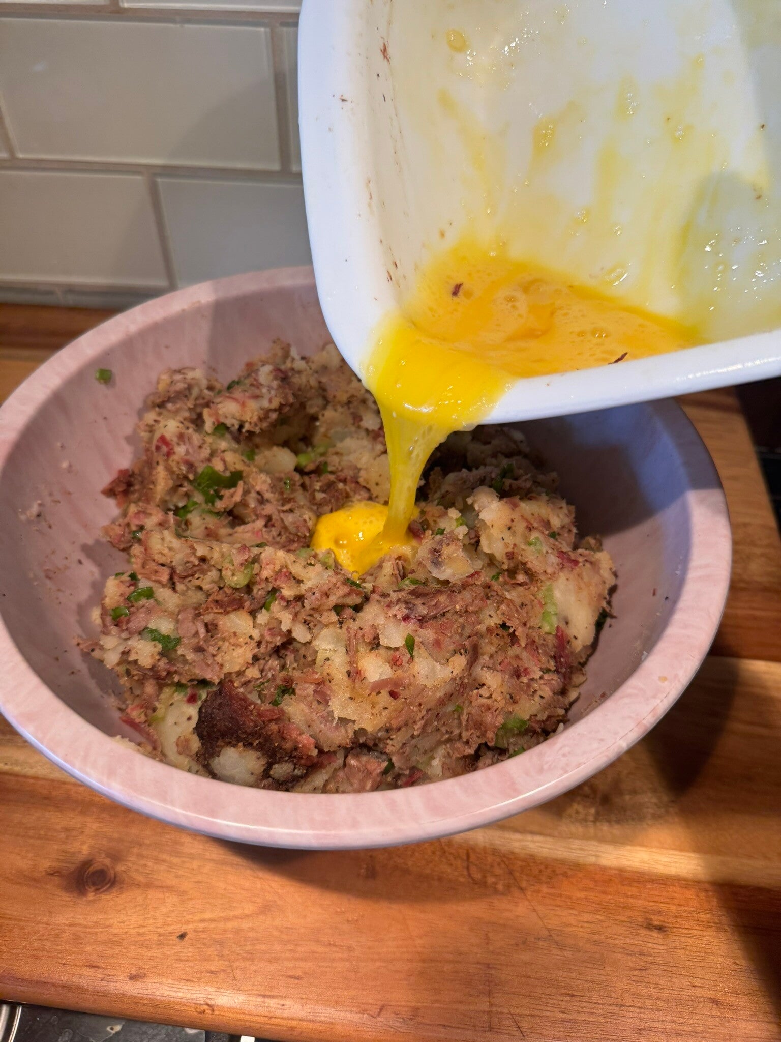 - In a large bowl combine brisket, potato, eggs, onions, garlic powder, salt and pepper