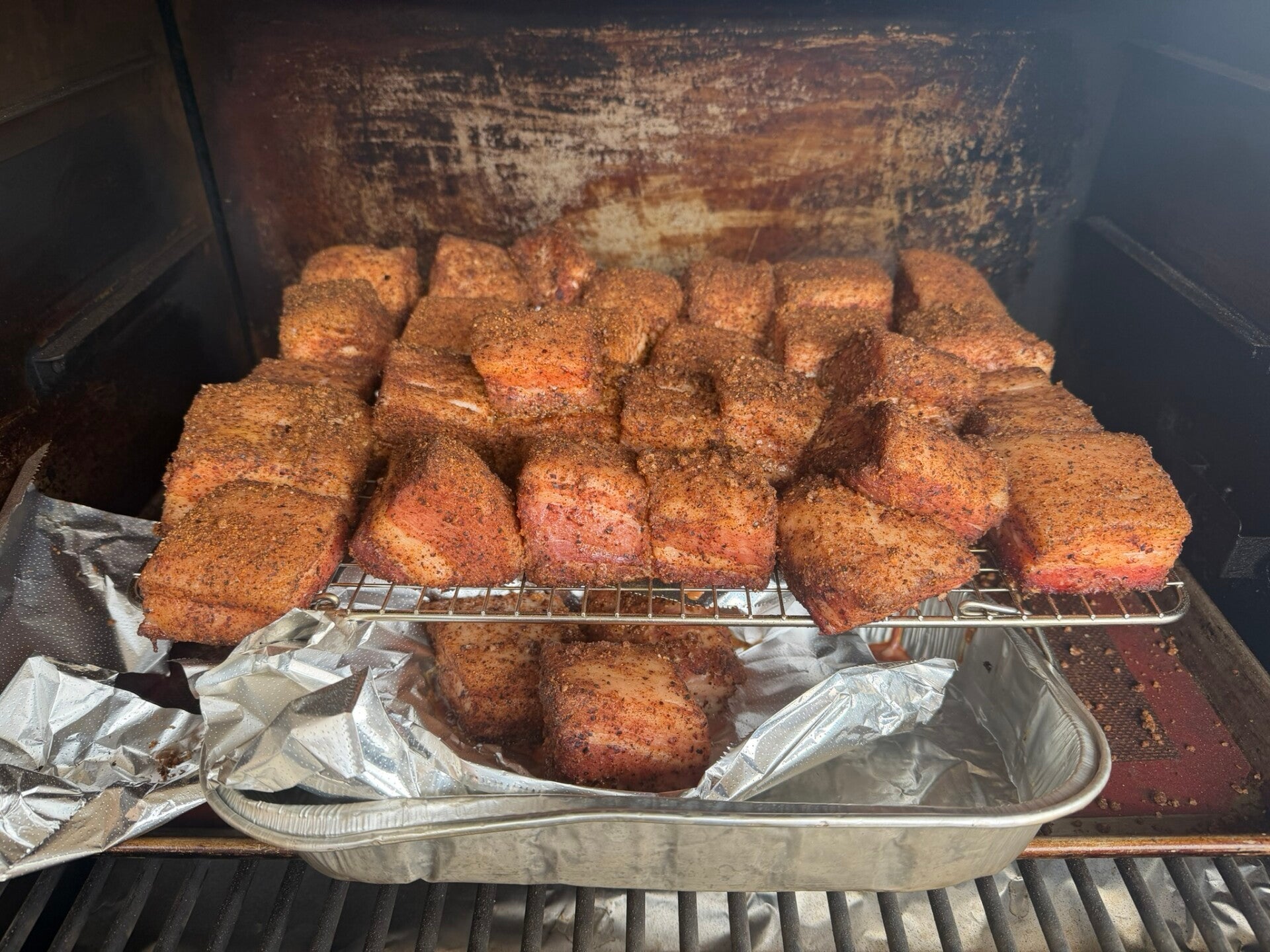 - Place on rack in the smoker, set to 250 F for 3 hours