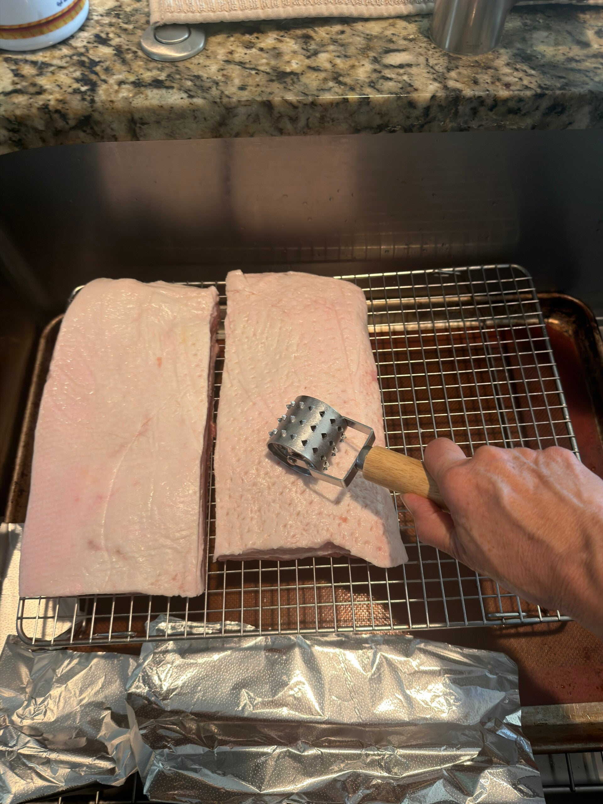 - Tenderize the skin with holes, not sure if it helps with flavor, but since I do it for a crispy skin, why not