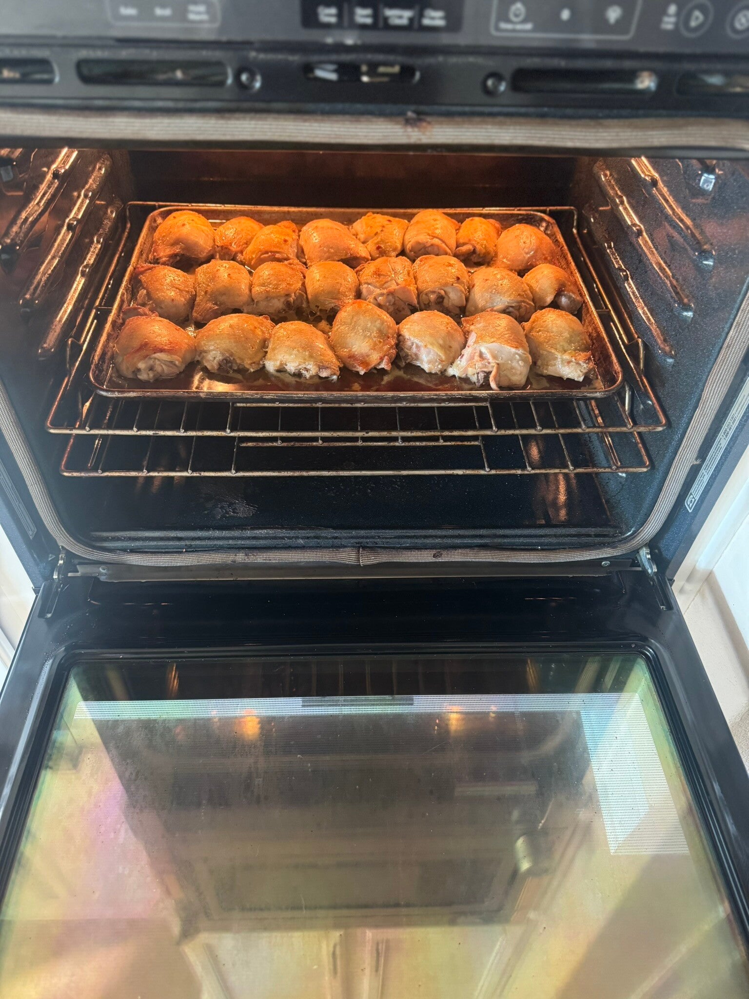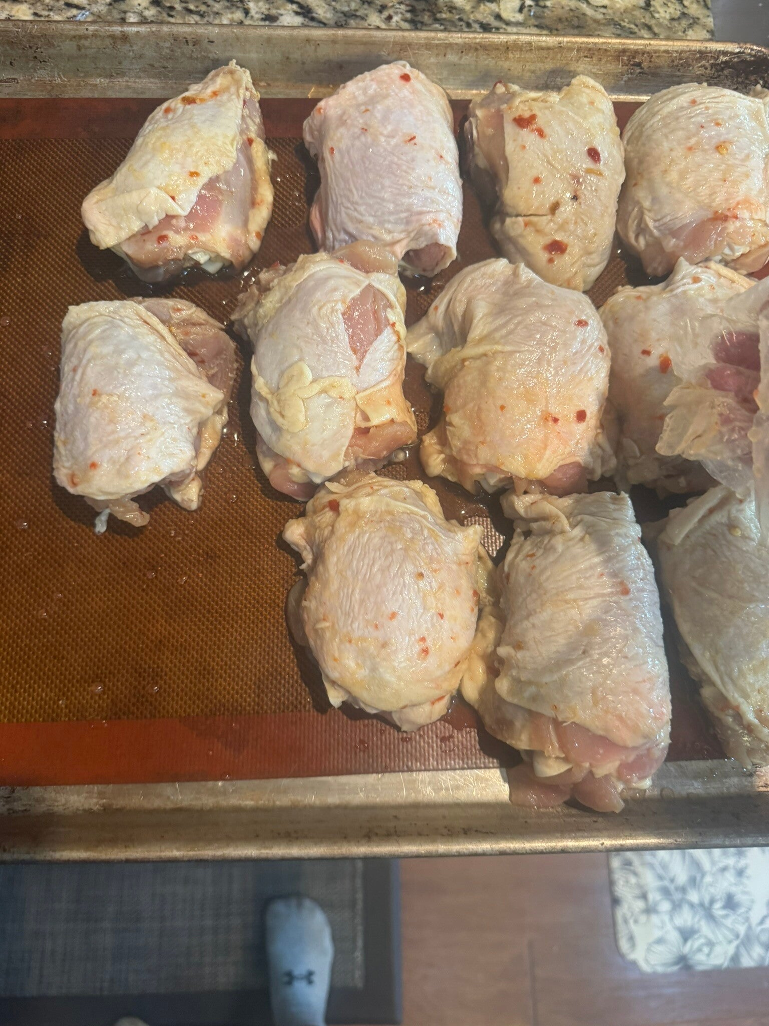 - Place marinated chicken on pan and bake for 30-40 minutes.