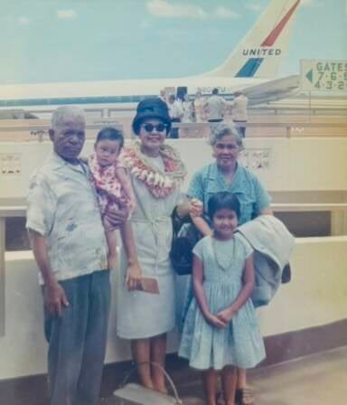 Auntie Shizu with flower leis leaving to join Auntie Chiyo in NYC, maybe 1964? Ojichan (Mom's dad) is holding me, those were the special days of traveling.