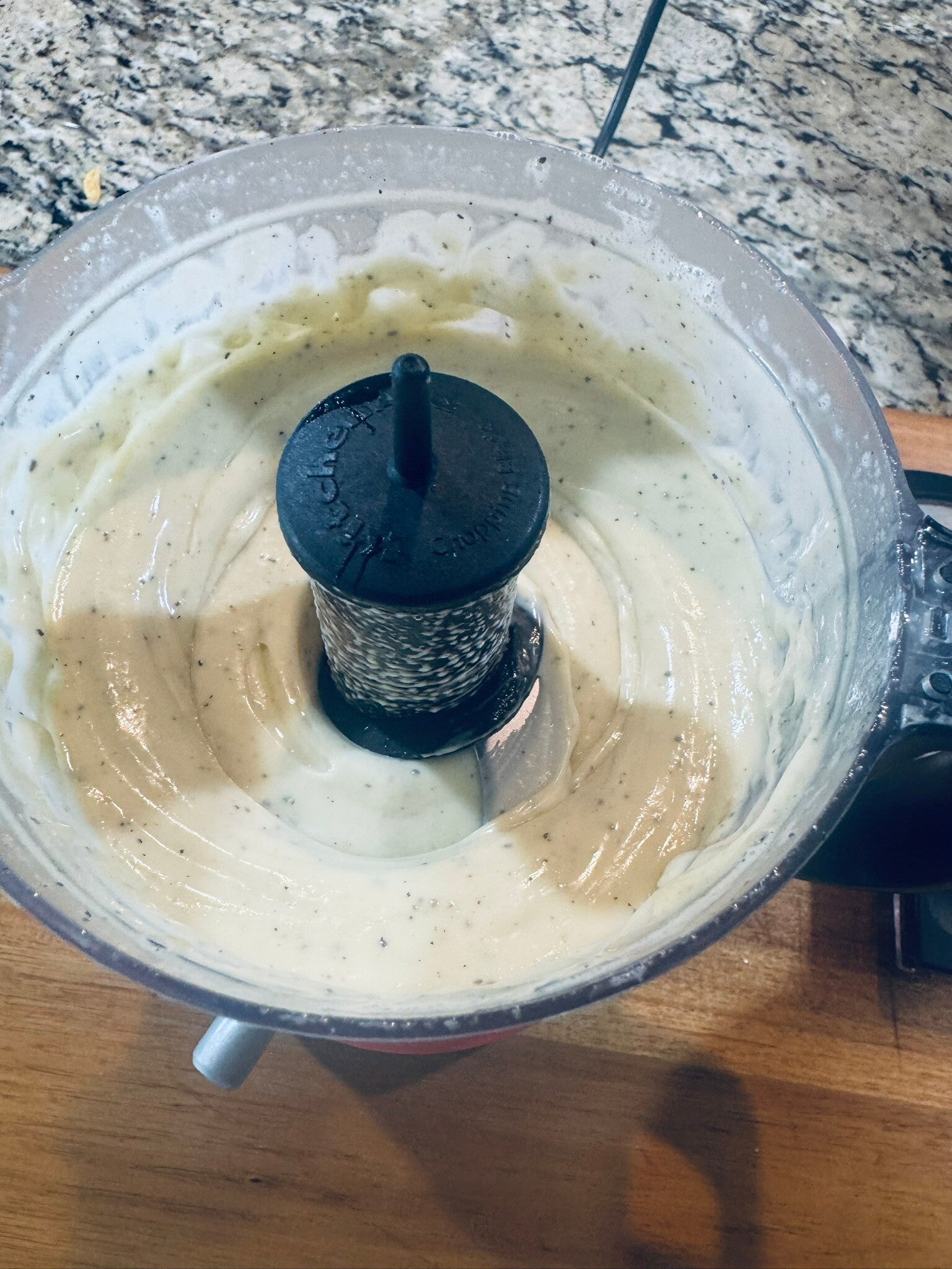- Slowly drizzle in the olive oil on low speed until the consistency thickens as the oil emulsifies to desired smoothness