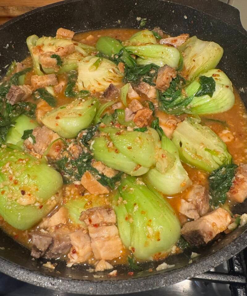 I had a jar of garlic chili crisp oil that was almost empty and thought why not try another way with a spicy version without separating the green & white parts and boiling a big pot of water first. I guess Asian markets don't have scales to weigh produce for impulse shoppers like me and over buy and turns into a new side dish to add to my rotation. I added leftover pork belly chopped to make this a heartier meal with rice, I suppose this could be a good vegetable only dish.
