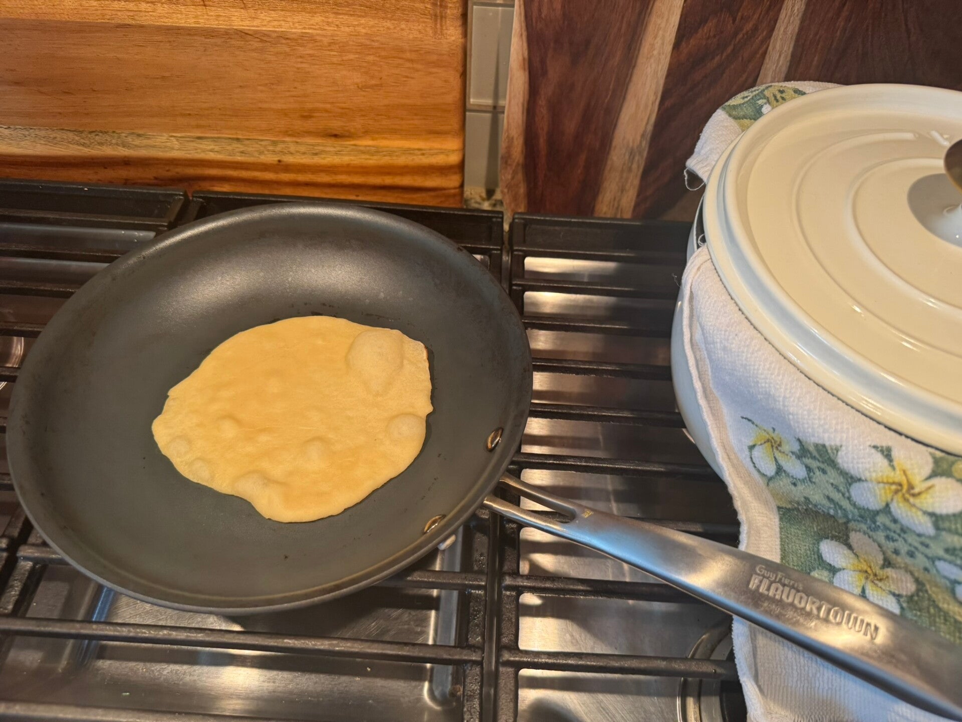 HEB has the best Butter Tortillas, but they’re often sold out when I want them. This recipe comes close when I’m in need of tortillas. I used the Chinese dumpling technique, rolling the dough into a 14" log and cutting it into 1" pieces, then rolling them out as thin as a dumpling wrapper. I think it’s great to blend cooking techniques from different cultures. Without a tortilla warmer, I used a cast iron pot to keep them warm. Sometimes you just have to make do with what you have. I also like having as few utensils as possible.